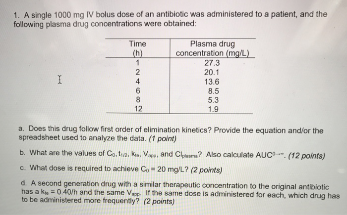 Solved 1 A Single 1000 Mg Iv Bolus Dose Of An Antibiotic Chegg Com